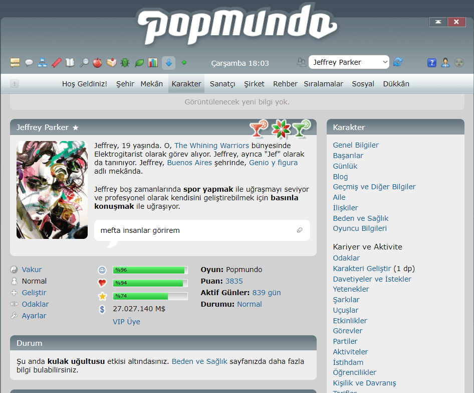 Popmundo da olabileceğiniz şeylerden bir kaçı şöyle:
